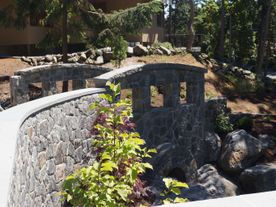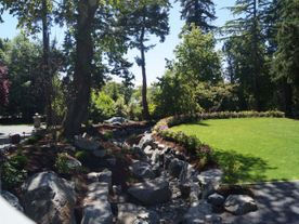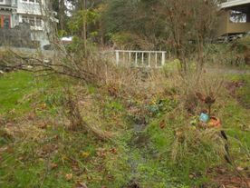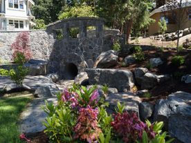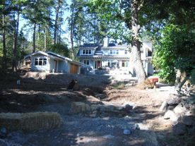 The client had a newly renovated house with on-site drainage issues and no usable space. The site was located in an environmentally sensitive area requiring special permission and a stipulated use of native plantings. It featured large mature fir, cedar and big leaf maple trees which presented challenges as well as opportunities. The paths and landscape elements had to be carefully designed around trees, and the construction had to navigate the dense forest.